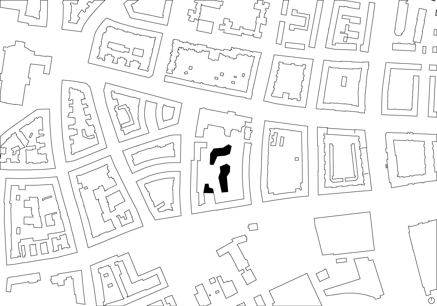 Die Neubauten passen sich an die Bedingungen des Ortes sowie den Baumbestand an und berücksichtigen die Abstandsflächen zum Bestand. Dabei bilden sie ausdifferenzierte Räume mit neuen Orten, die den gesamten Hof durchlässig und als Ganzes erfahrbar machen. Der Hof wird neu geordnet: Der eher ruhigere Gartenhof bleibt frei, der belebtere Hof an der Ostseite des Ensembles dient der Erschließung der Häuser und ist stärker befestigt. Die Passage zwischen den Gebäuden steht als engerer Raum in einem spannungsreichen Kontrast zu den übrigen Hofräumen.