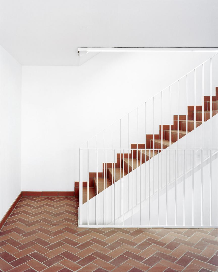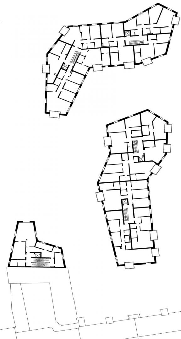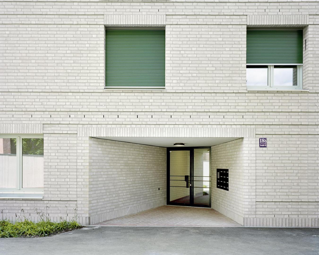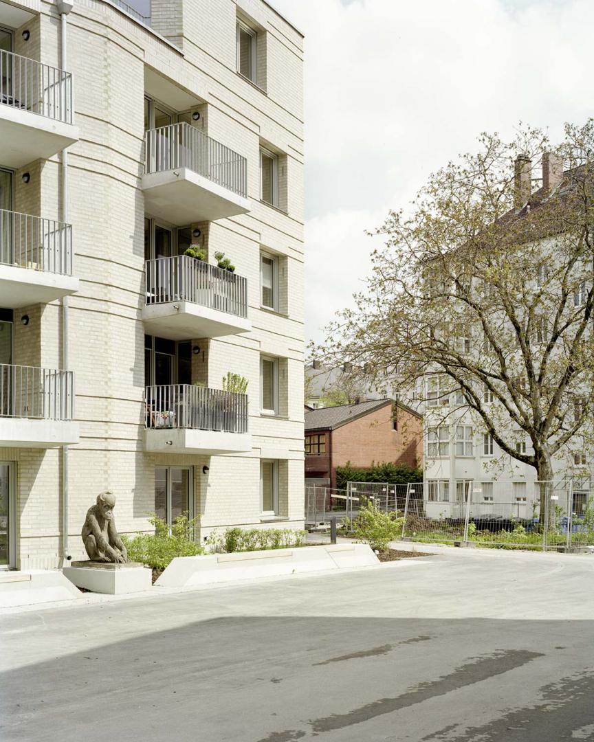 Die beiden neuen Baukörper beherbergen jeweils zwei Wohnhäuser. Diese sind als 3- und 4-Spänner organisiert. Das dritte neue Gebäude im Hof befindet sich an der Brandwand im Süden und wird als Kinderhaus genutzt. Die Gestaltung der zweischaligen Mauerwerksbauten wurde aus den umgebenden Gebäuden entwickelt: Die hellen Mauerwerksfassaden der Neubauten sind farblich an die bestehenden Wohngebäude angelehnt und nähern sich in ihrer Struktur und Materialität an die Klinker der Kirche an. Die Profilierung an der Fassade in Form von umlaufenden Bändern bezieht sich auf die Fensterbrüstungen und -stürze der unterschiedlichen Fensterformate. Die Farben der Fenster und des Sonnenschutzes sind jeweils leicht unterschiedlich – so findet man drei eigenständige Individuen im Hof.