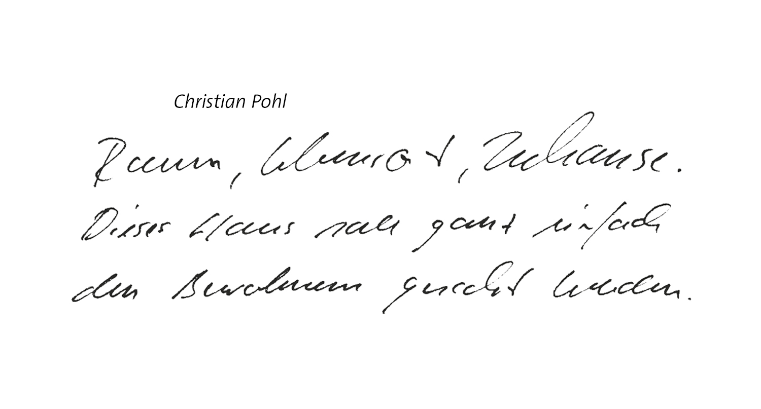 Der scharf geschnittene Baukörper folgt einem subtraktiven Gestaltungsprinzip und transferiert es aus einem formalen in einen architektonischen Zusammenhang. Einschnitte formulieren den überdachten Eingangsbereich, den Treppenraum, die Dachterrasse im Obergeschoss oder die Öffnung des Wohnzimmers zum Garten. Gestalterische Elemente des „bürgerlichen Wohnens“ der ersten Siedlungshäuser sind in die Gegenwart übersetzt worden: die Terrasse mit Außentreppe, die Sitz- und Blumenbank im Wohnzimmer, die Dachterrasse, die bodentiefen, zweiflügeligen Fenster, die „Laube“ unter der Hainbuche ...
